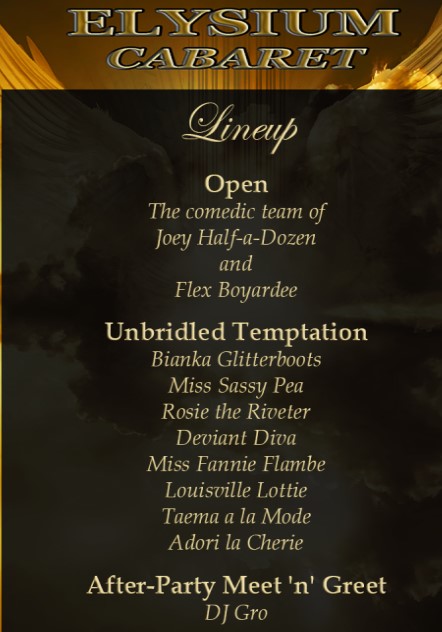 Elysium Cabaret – a command performance – presented by the Mancini Group – Unbridled Temptation for more information on this exciting event, please contact LilyNeeAnne Hilite lilyneeanne@aol.com or KT Syakumi ktsyakumi@dymoonqy We received a book with a lot of information, I would suggest you contact the group so you can see all that will be happening during this event. Of particular interest to me will be the dancers…It promises to be an event you won’t want to miss.