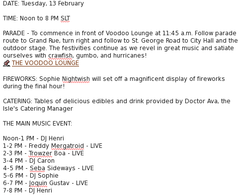 There is a grand parade that will circle some of the city blocks around the town hall, followed by music. The streets are gaily decorated, the spirit of Mardi Gras is everywhere. Come early, the Island is a wonderful place to explore, and live!