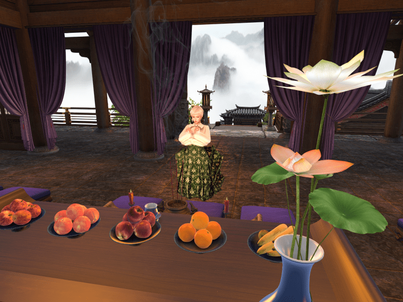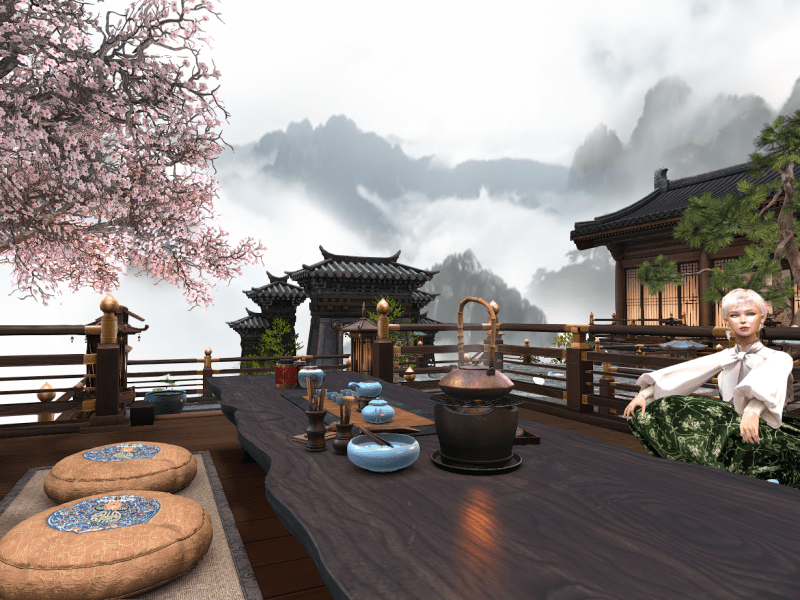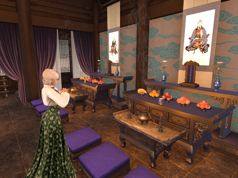 Over my many years in SL I have gone to and seen many representations of China/Asia … this is the first destination that took my breath away… why… because it brought back memories of my childhood. Some of the rooms, the traditional decor of another era.. when people immigrated to America, they brought with them their cultural philosophies and beliefs.. There were no buildings like you see in this build, but the atmosphere and the alters/ prayer benches ,, paintings.. were recreated in rooms.. so when you walked in, you felt the serenity and the tranquility of the room.
