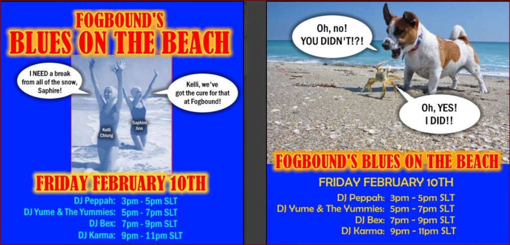 Who doesn’t want to feel gritty sand underfoot, and hear the waves crashing unto the beach, we all do … So Fogbound is hosting a day at the beach Friday Feb. 10th. DJ Yume and the Yummies will be there at 5 pm slt. Taxi to FogBound .. hit logo.